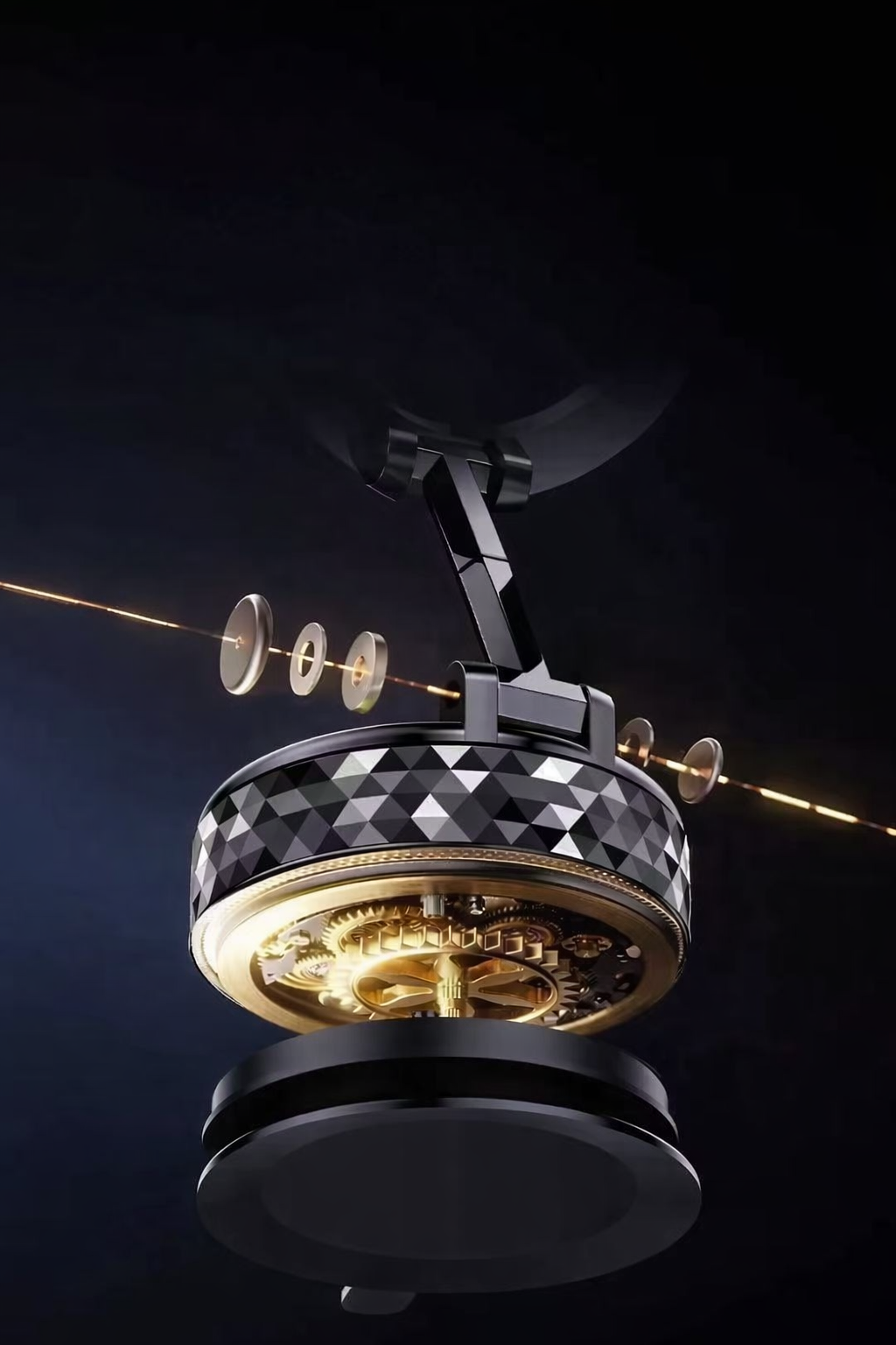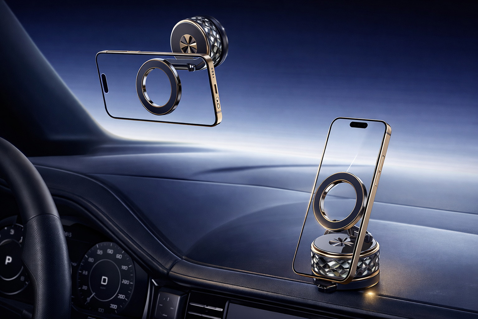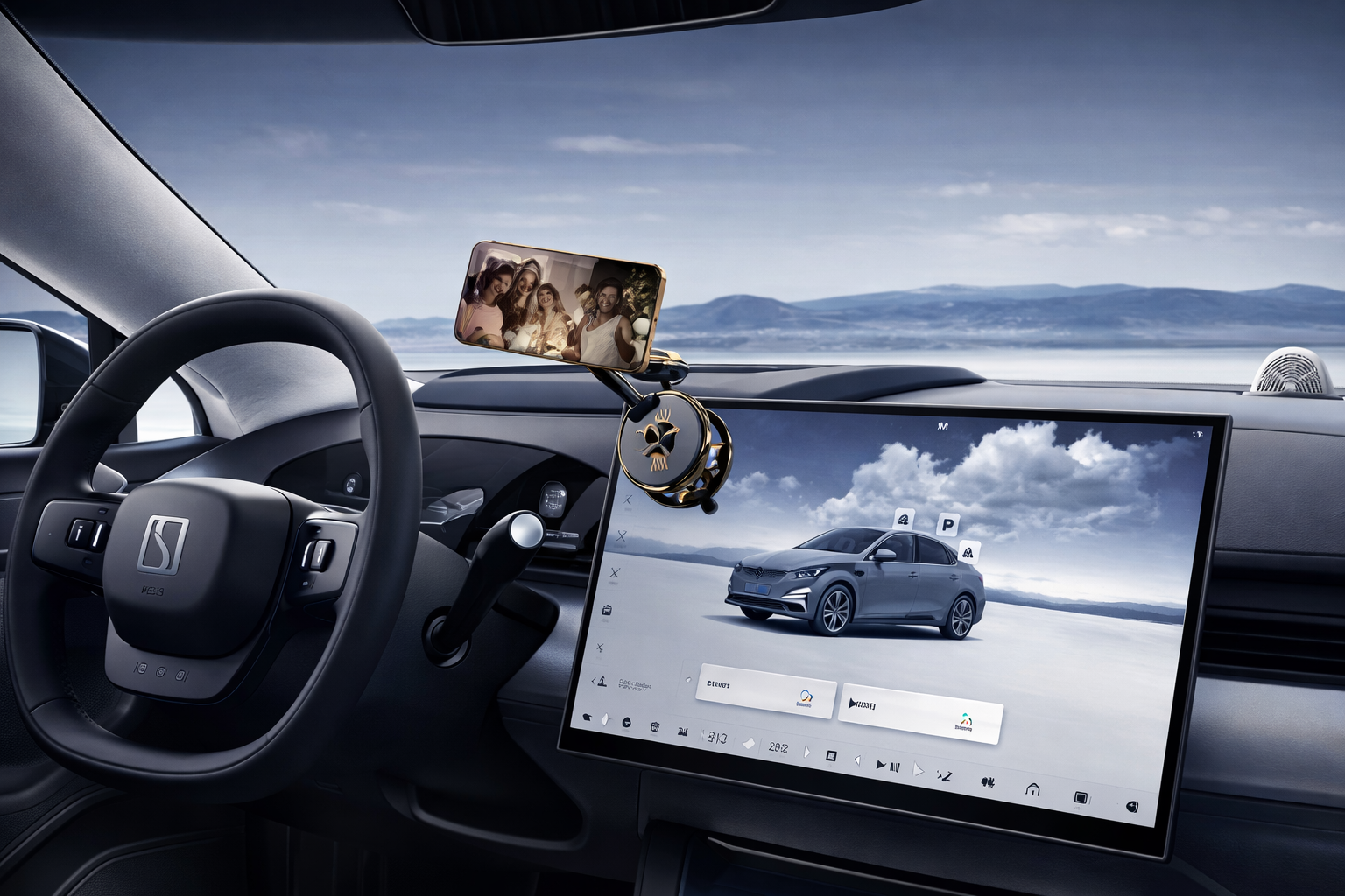 O suporte permite rotação e inclinação ajustáveis, garantindo um ângulo de visualização ideal para navegação GPS, chamadas em modo mãos-livres ou controlo de música. O design compacto ocupa pouco espaço no interior do veículo, mantendo um aspeto moderno e discreto.