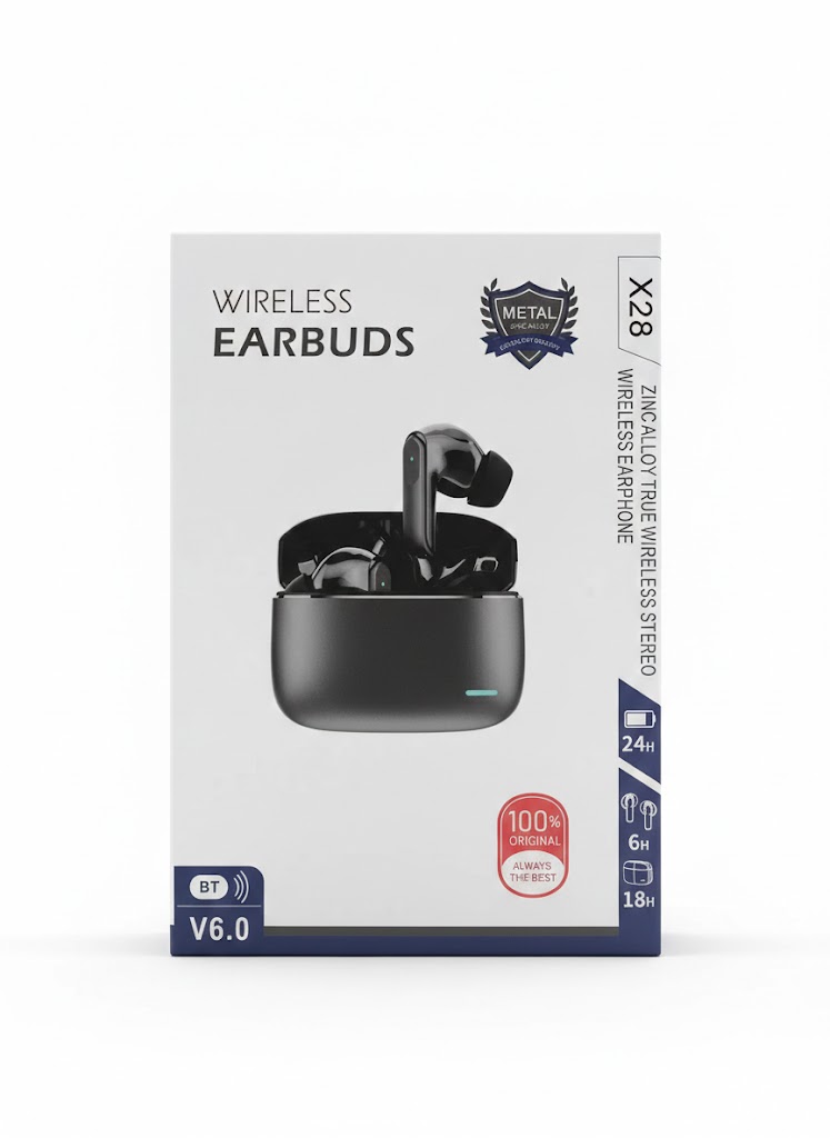 Experience true freedom with the X28 Wireless Earbuds. Featuring a compact ergonomic design, stable Bluetooth connection, and clear sound quality, the X28 is perfect for daily use, workouts, and travel.